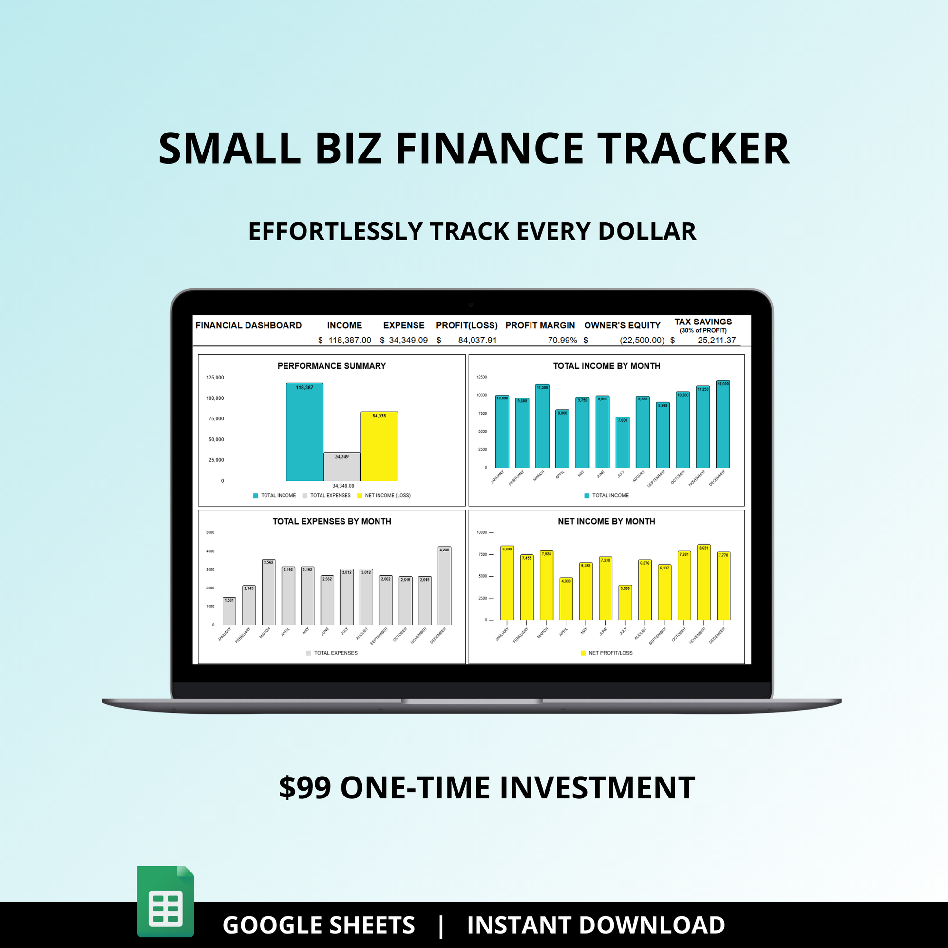 Stop feeling overwhelmed by your finances and finally get the financial clarity and confidence your business deserves. Get your Small Biz Finance Tracker and start your journey toward peace of mind and profitability today!